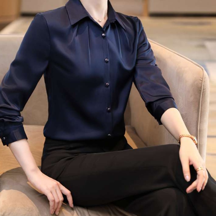 シルクのような上質な光沢感が魅力のネイビーシャツは、プリーツ襟のデザインが特徴的で春のレディースコーデに品格を与えます。