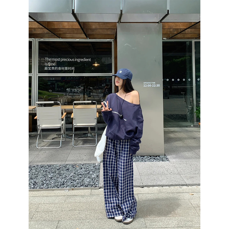 肩開きデザインが魅力的なレディースネイビーゆるだぼスウェットコーデ