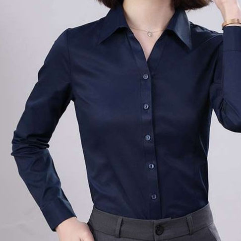 50代の女性に最適な、シルクのような滑らかな質感が魅力のネイビーブラウスです。