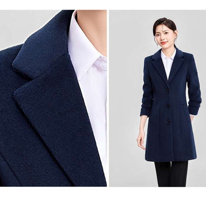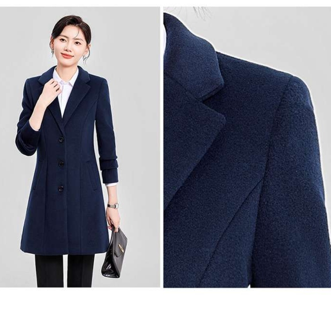 フラットな襟元のデザインで、知的で落ち着いた雰囲気を演出し、ビジネスシーンでも活躍。