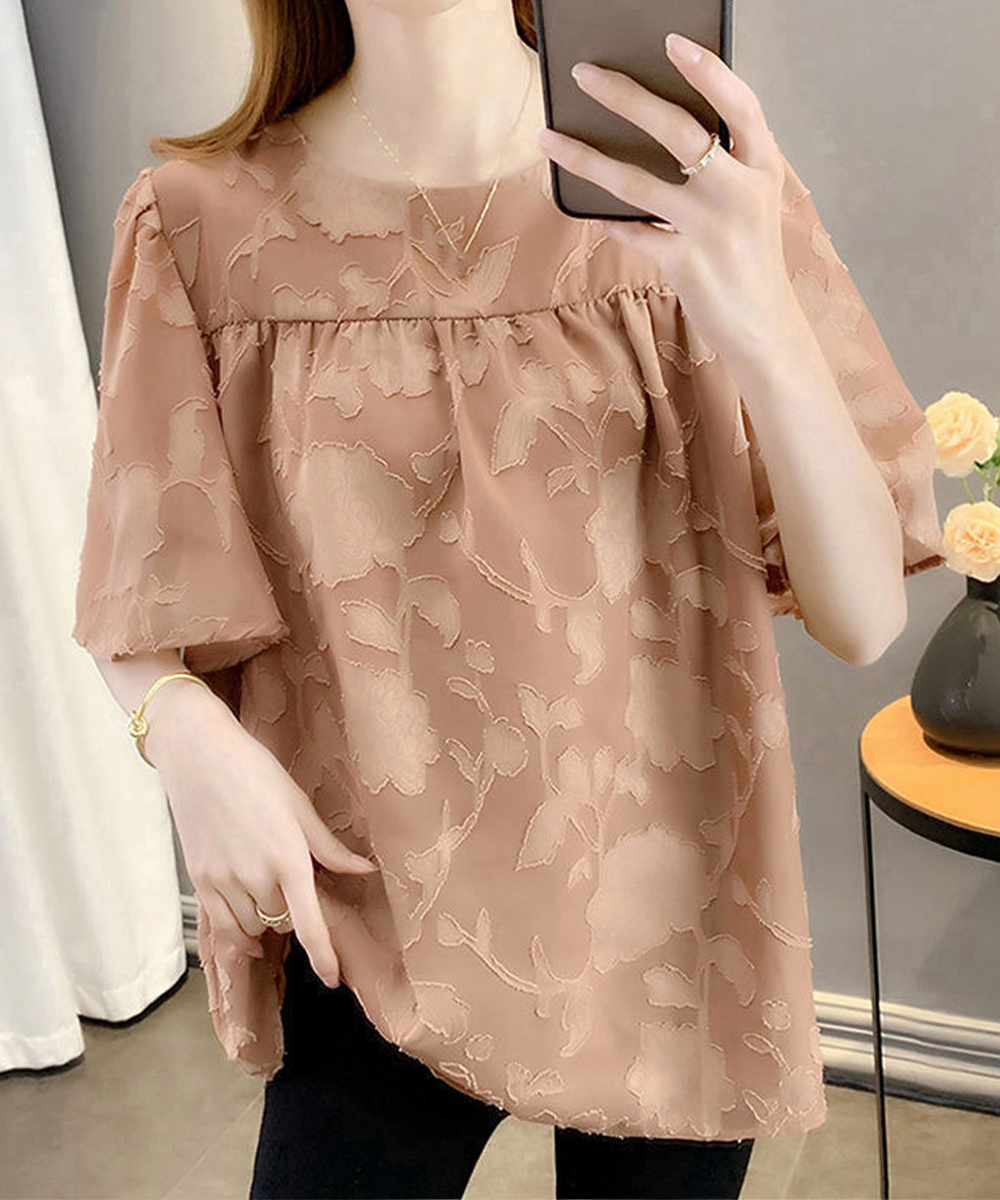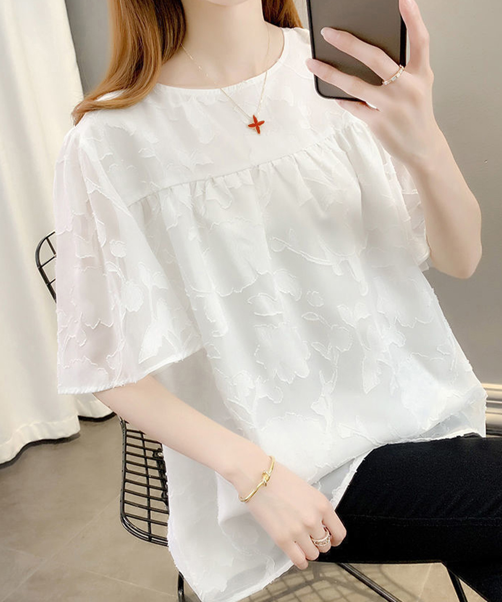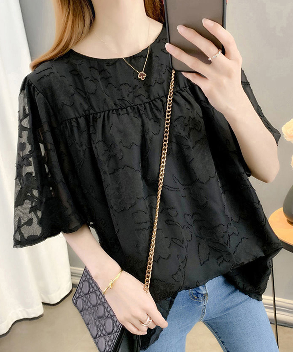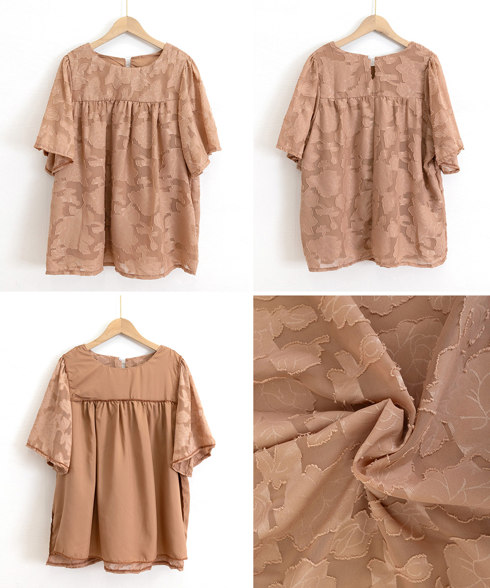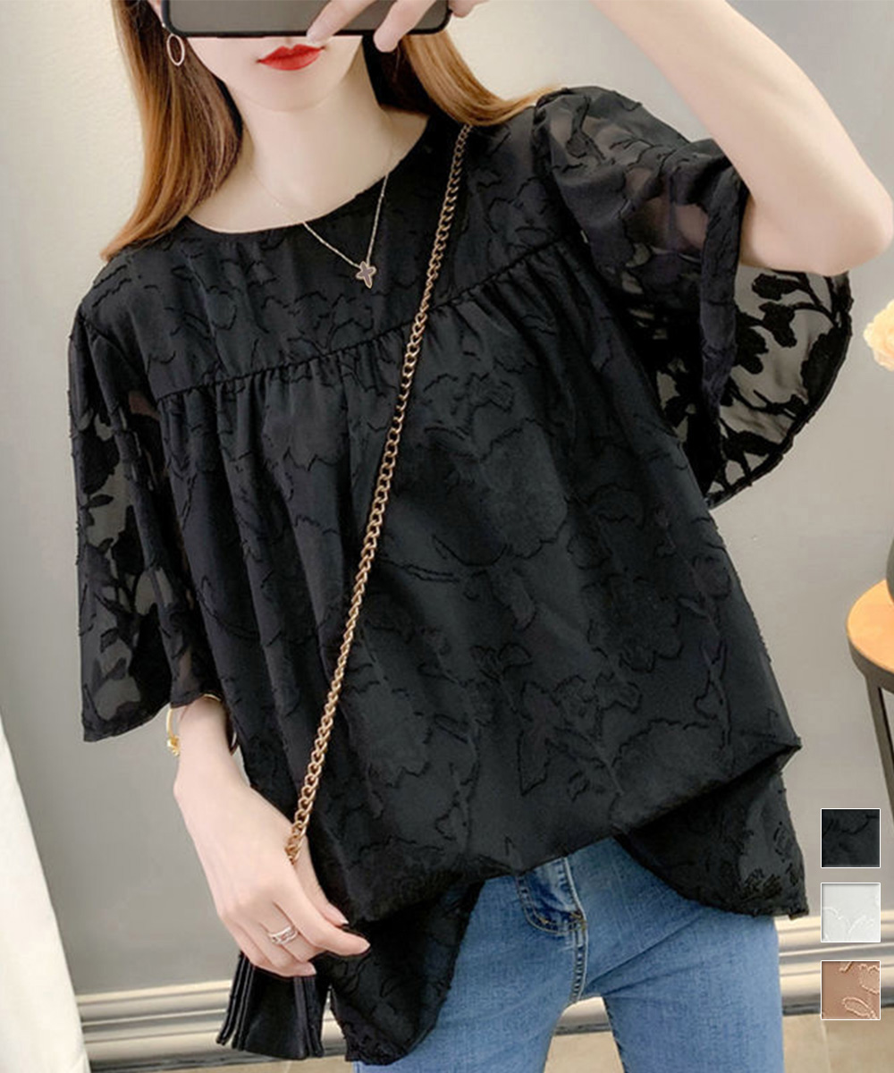 上品な花柄刺繍が美しいフレア袖デザインのブラウスです。袖に程よいボリュームがあり、女性らしい印象を演出します。