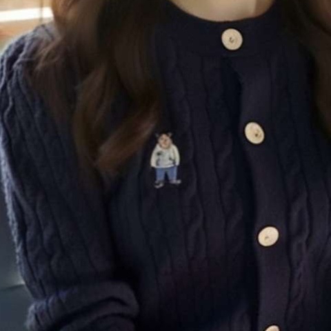 ネイビーコーデにぴったりなケーブル編みカーディガン。大きな白ボタンとワンポイント刺繍がアクセントとなり、愛らしさを引き立てます。波打つ編み目模様が上品な印象を与え、シンプルなスタイルに華やかさをプラス。デイリーから特別な日まで幅広く活躍するアイテムです。ネイビーを基調にしたコーディネートに最適な一着。