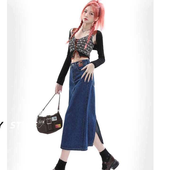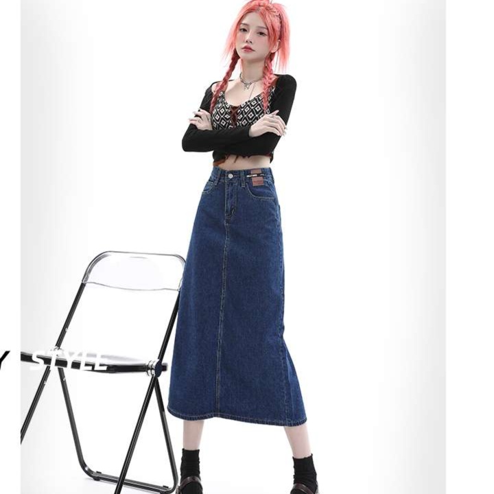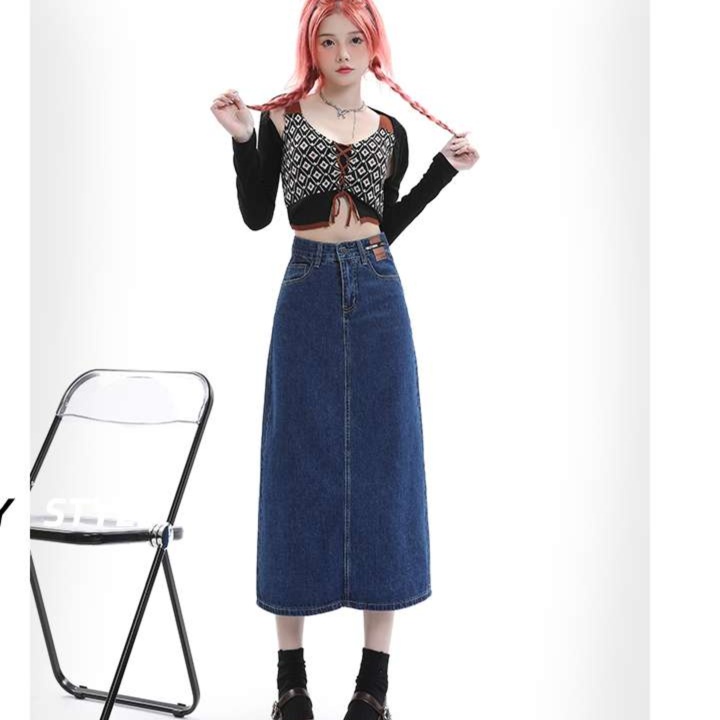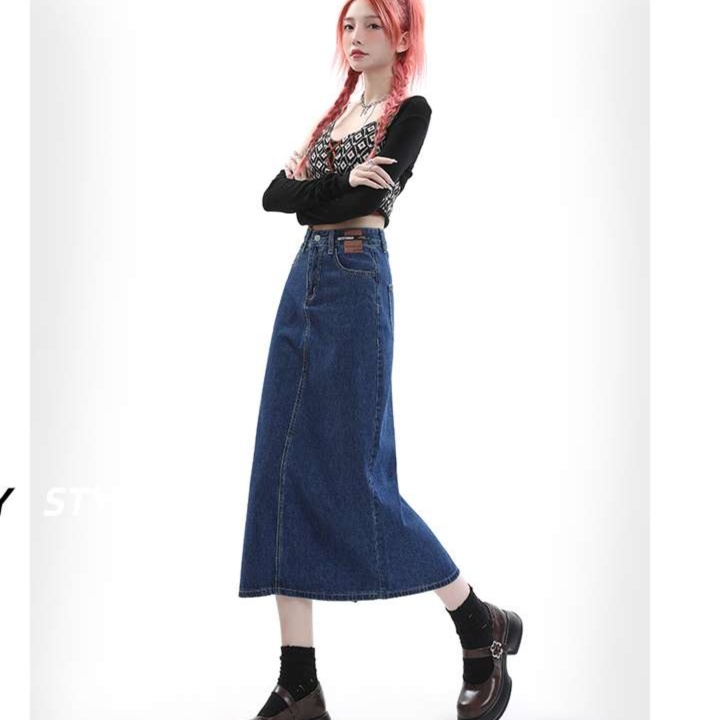 しっかりとしたデニム素材で上品な印象を与え、ミモレ丈で大人の女性らしさを演出します。