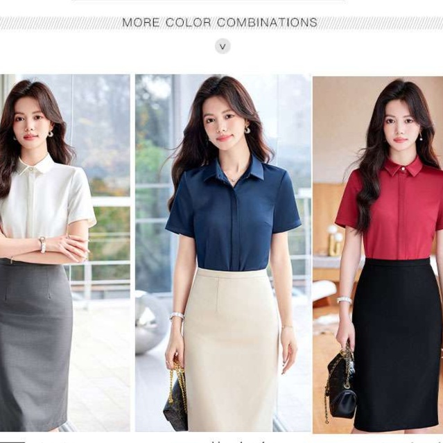 シンプルできちんと感のある襟元で、オフィスやビジネスシーンで好印象を与えます。