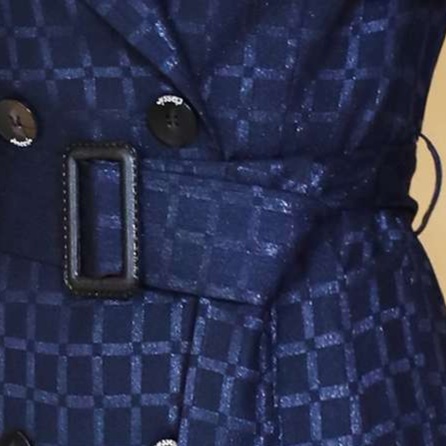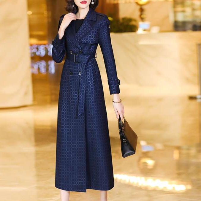 ネイビーコーデの洗練された幾何学模様が特徴的な、ベルト付きのロングコートドレス。襟元のデザインと、すっきりとしたシルエットが上品な雰囲気を演出。足元までの優雅な丈感で、フォーマルなシーンにも対応できる一着。