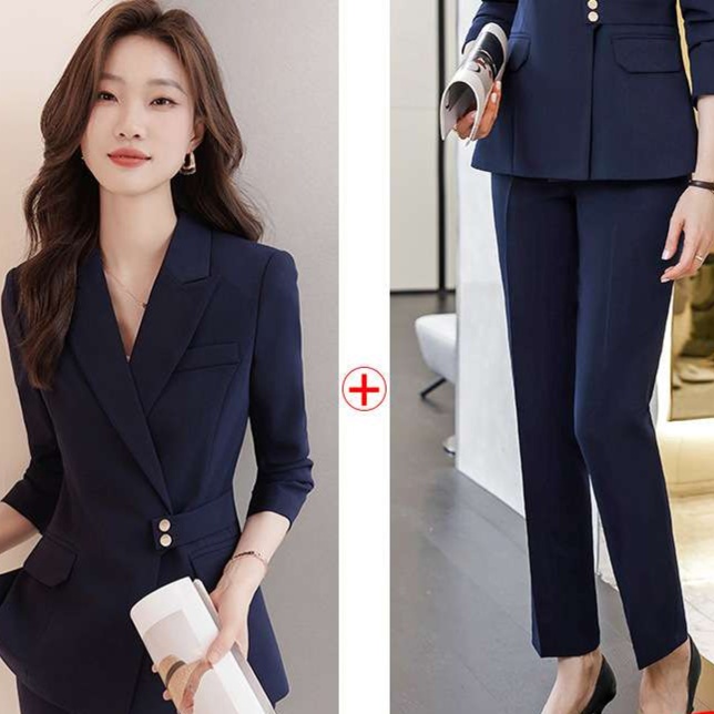 ネイビーコーデにぴったりなセットアップ、ウエストの二つボタンが知的な印象を際立たせるデザイン。やや長めの着丈が足長効果をもたらし、スタイリッシュなシルエットを実現。通勤やフォーマルシーンまで幅広く活用できるため、毎日のスタイリングに役立つ一着。ネイビーの深みが魅力を引き立て、洗練された印象を与えます。